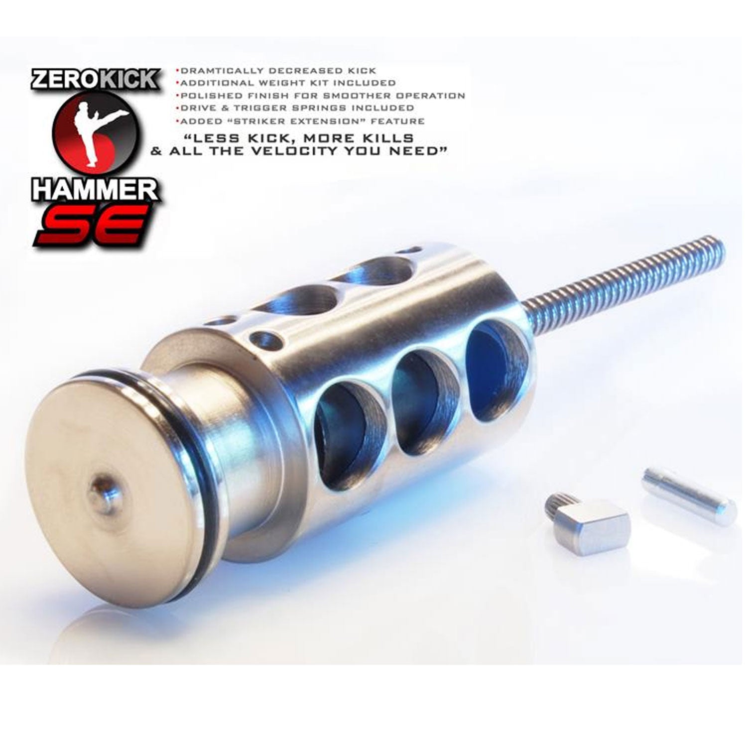Zero Kick Hammer Mk2 design is nearly half the weight of the stock hammer and hand polished. These two things combined make for dramatically improved firing characteristics and shot grouping that you can see and feel with every shot.