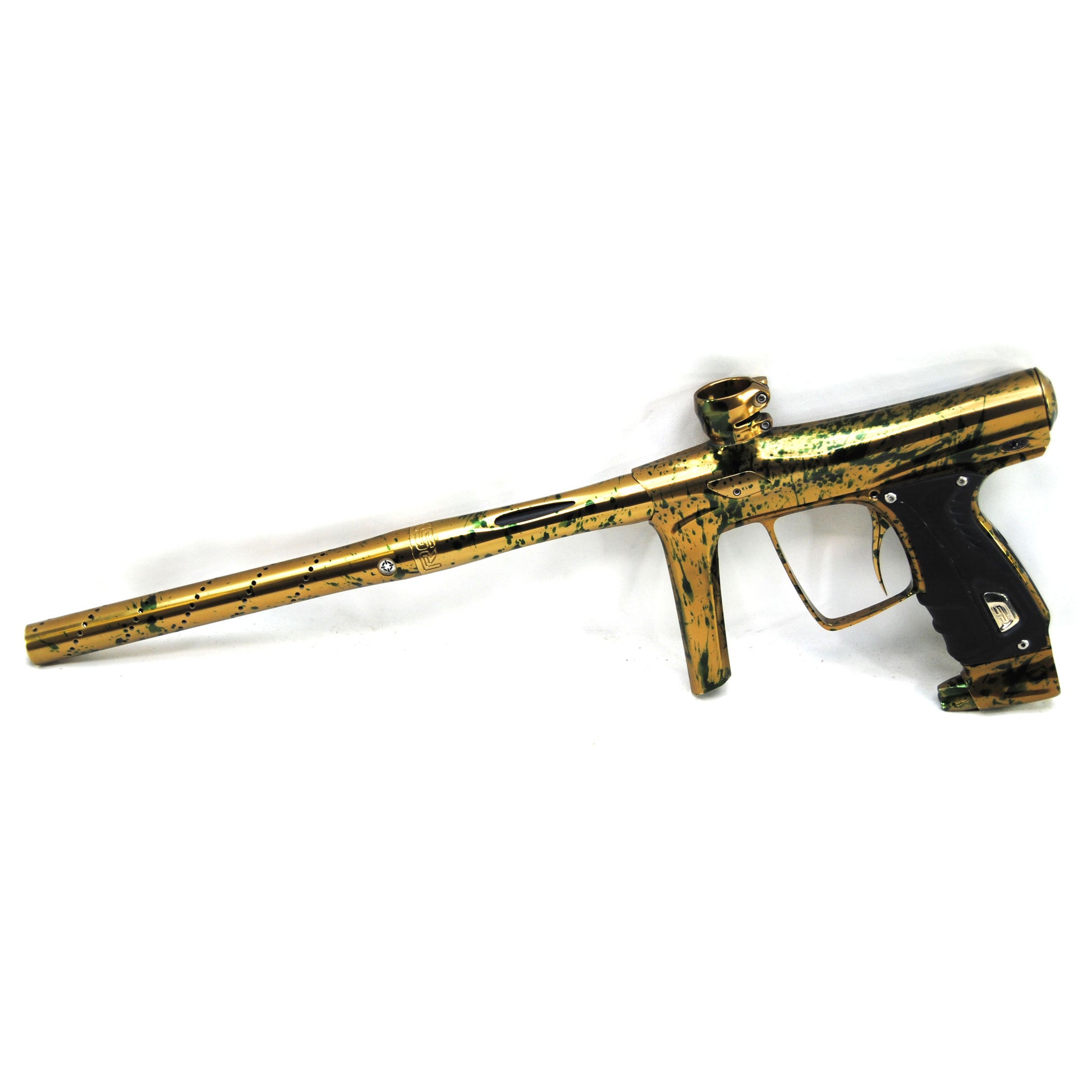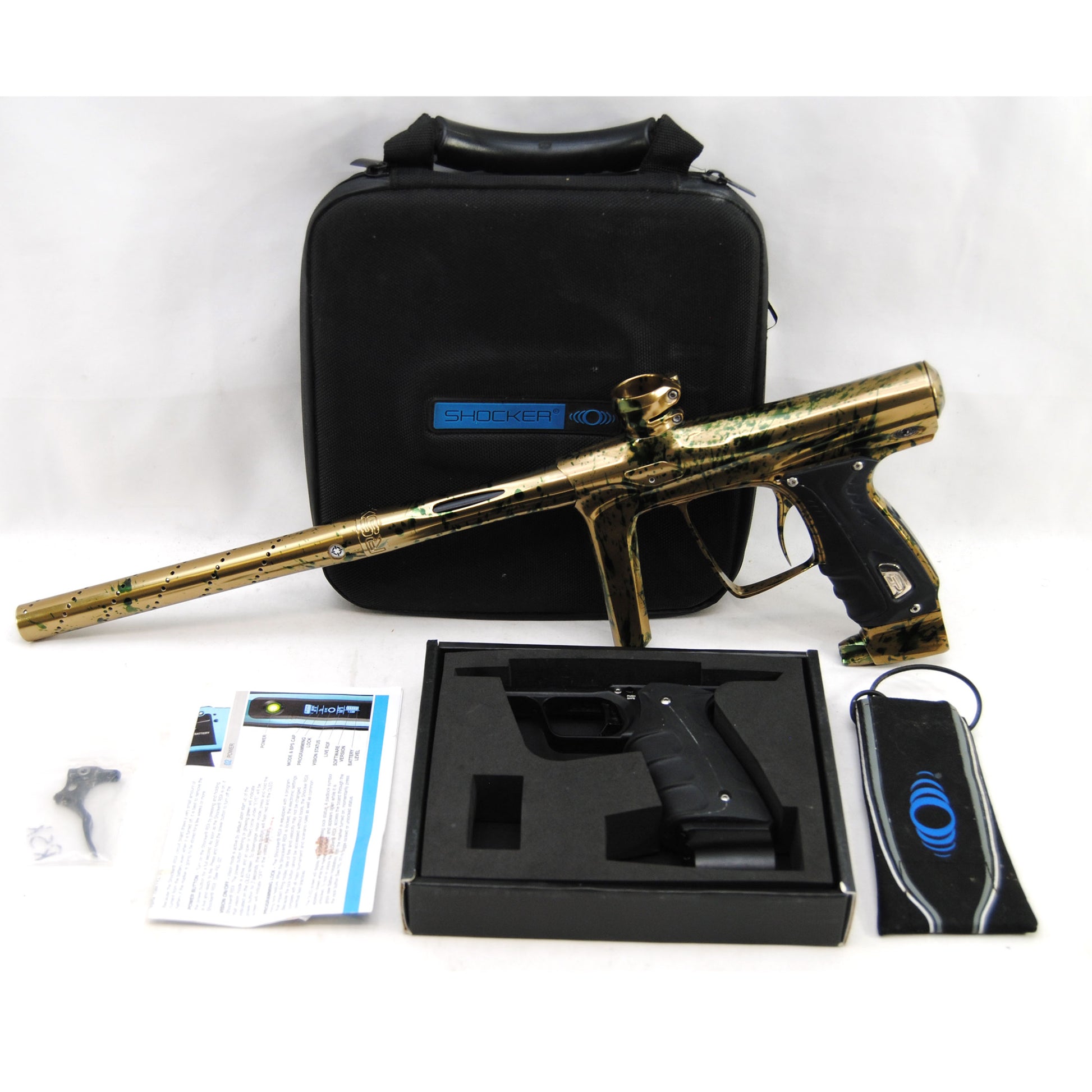 This marker comes with everything shown in the pictures. The marker has minor scratches on the barrel tip and regulator as well as minor paint blemishes on the grips. It has been tested by our factory trained technician and was found to be in working condition.
